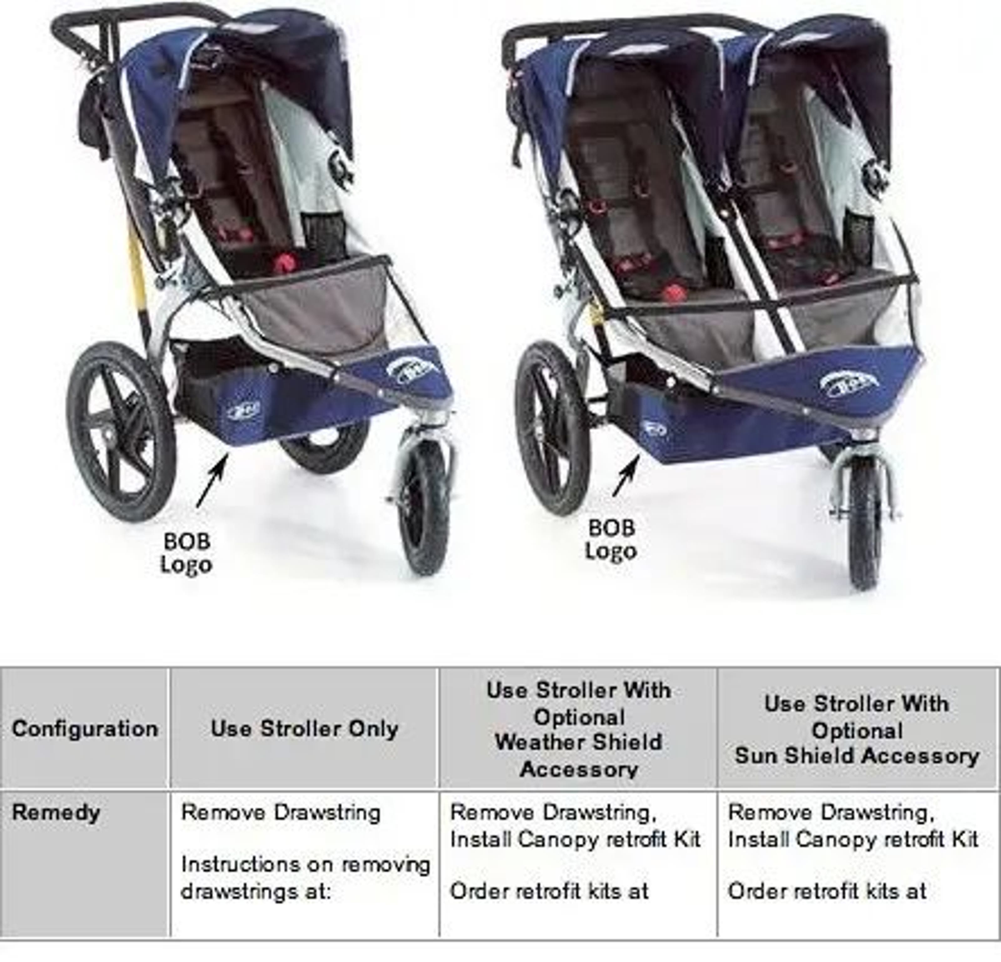 Remedy: Consumers should immediately stop using the recalled strollers and remove the drawstring. If using a separately purchased Weather Shield or Sun Shield accessory with the recalled stroller, contact BOB Trailers for a free canopy retrofit kit.