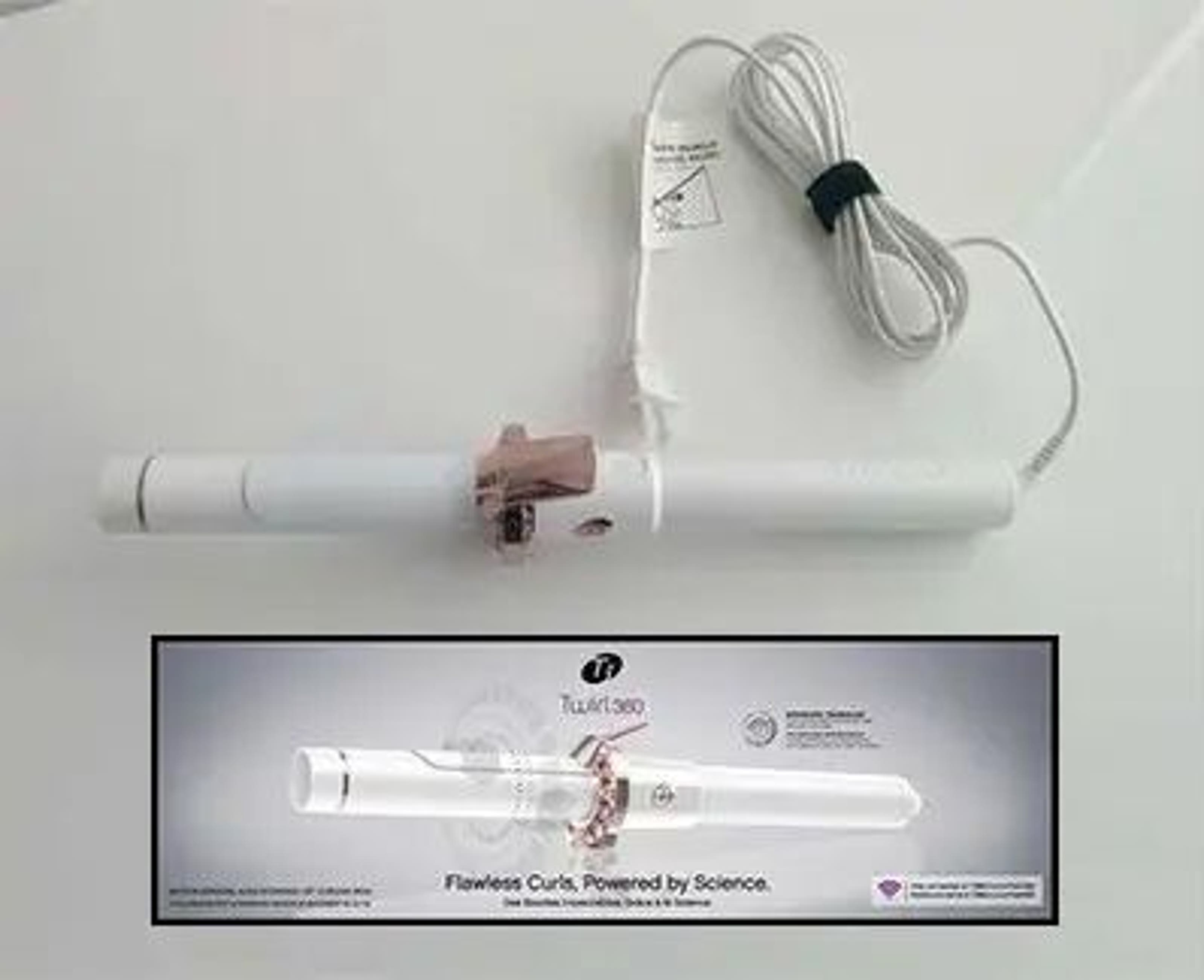 Description: The T3 Micro Twirl 360 Motion-Sensing Auto-Rotating 1.25 inch Curling Irons have a white plastic handle, a white metal rotating heat barrel and clamp, and a rose-gold colored grip. Model number 76570 is printed on the label found on the handle of the tool, and T3 is printed on the curling iron s barrel.