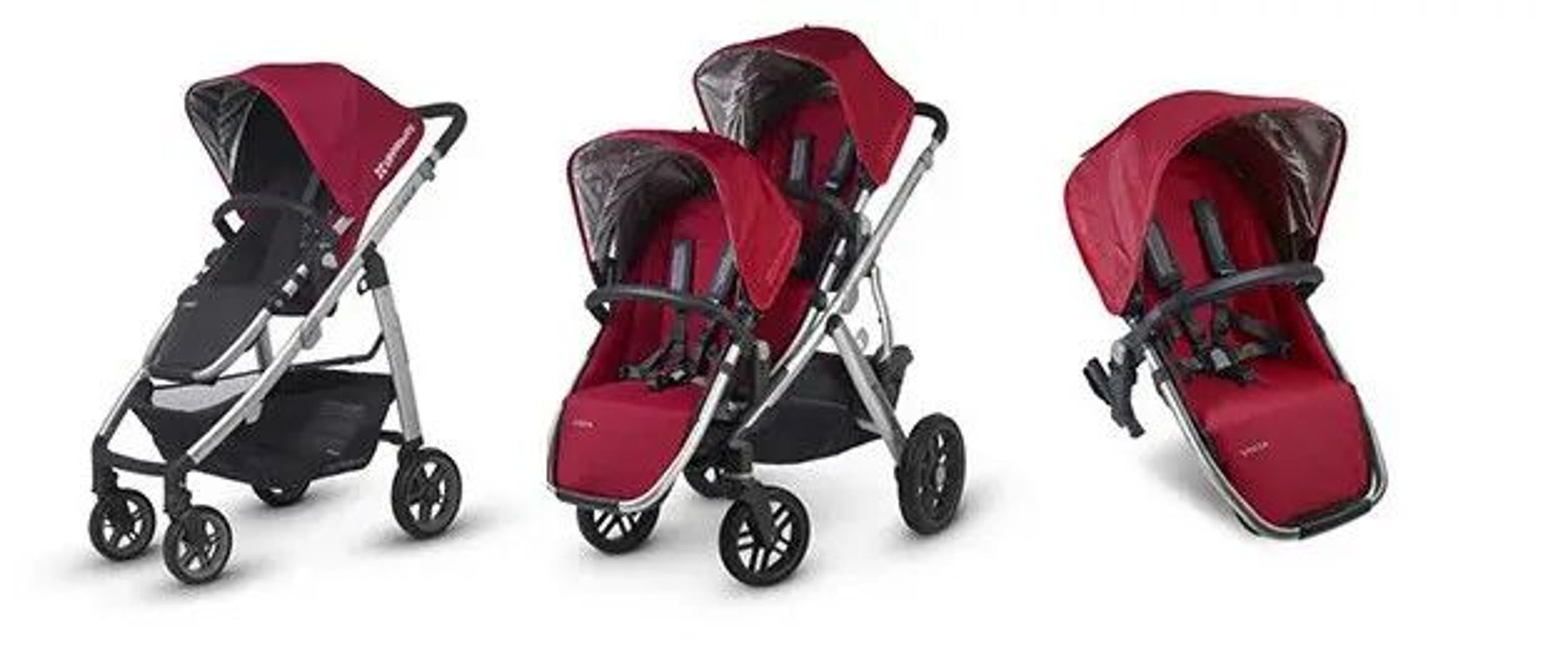 Description: The CRUZ strollers (0181-GEO, CRUZ STROLLER-GEORGIE) have an aluminum alloy grey or black frame, a black fabric toddler seat, a colored fabric sunshade canopy and a black basket under the seat. The VISTA strollers (0101-GEO, VISTA STROLLER-GEORGIE) have a grey or black aluminum frame and a colored sunshade canopy, and are made to hold one, two or three children. "VISTA" is printed in white lettering on the handlebars of the stroller, and "UPPAbaby" is printed across the bottom diagonal rail of the stroller frame next to the black, fabric basket. The RumbleSeat (0252-GEO, VISTA RUMBLESEAT-GEO) is a separate seat attachment that can be attached to the stroller frame. RumbleSeats have manufacture dates stamped on the bottom of the seat. The RumbleSeat comes in various colors and allows the child to ride rear facing, forward facing or reclined. All strollers and RumbleSeats have a foam bumper bar across the middle of the product for the child to hold.