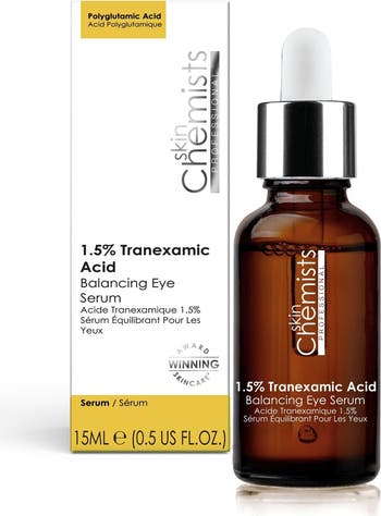 skinChemists .% Transexamic Acid Balancing Eye Serum ml Aqua (Water), Glycerin, Tranexamic Acid, Caprylyl/Capryl Glucoside, Phenoxyethanol, Benzyl Alcohol, Sodium Hydroxide, Carbomer, Sodium Hyaluronate, Camellia Sinensis (Green Tea) Leaf Extract, Allantoin, Ethylhexylglycerin, Dehydroacetic Acid, Albizia Julibrissin (Persian Silk Tree) Bark Extract, Sodium Benzoate, Potassium Sorbate, Aloe Barbadensis Leaf Juice Powder, Darutoside. Eye Care Brightening Eye Serum For Dark Circles Dull Eyes – Your Revitalising Solution Struggling with dark circles or tired-looking eyes? Our Brightening Eye Serum is expertly crafted to target common concerns around the delicate eye area. Infused with .% Tranexamic Acid, Aloe Vera, and Green Tea Extract, this lightweight serum brightens, hydrates, and revitalises for a refreshed appearance. What It Does: Brightens evens skin tone with Tranexamic Acid for a luminous look Hydrates calms with Aloe Vera to soothe the eye area Enhances resilience with Persian Silk Tree Extract for daily protection Lightweight formula absorbs quickly, perfect for layering under makeup The Solution: Dark circles? Brightening ingredients work to reduce their appearance. Dull eyes? Hydration and nourishment leave your eyes looking vibrant. How to Use: Apply a small amount around the eye area morning and night. Follow with your favourite moisturiser for best results. Why You ll Love It: Suitable for all skin types, including sensitive Free from parabens, sulfates artificial fragrances Experience the difference – Shop now! Apply these products during your skincare routine, focusing on concerned areas. Always do a patch test before use.