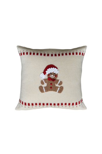 This festive knit holiday throw pillow features a delightful gingerbread man dressed in a cozy Santa hat, bringing a cheerful holiday vibe to your home décor. The pillow is crafted with intricate crocheted details. Perfect for adding a playful and charming accent to your living space, this pillow is sure to become a favorite holiday staple year after year. Crafted from high-quality cotton yarn, this pillow adds a cozy, seasonal flair to any room. Whether placed on a couch, chair, or bed, its vibrant colors and unique design are sure to catch the eye and bring holiday cheer to your space.