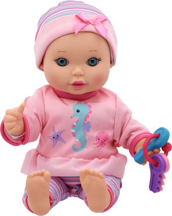 LITTLE DARLINGS: FUN WITH KEYS - 12" BABY DOLL - Welcome to a world of interactive joy with the Little Darlings 12" Fun with Keys Baby Doll! This charming 12-inch doll features a soft, cuddly body that s perfect for little ones who love to hug and cuddle. The Fun with Keys Baby Doll comes to life with her playful key-shaking feature. Simply wave your hand near her face, and watch as she joyfully shakes her colorful keys, accompanied by infectious giggles and cheerful laughter. It s a captivating interaction that will keep your child entertained and delighted for hours. Dressed in an adorable pink top adorned with a sweet seahorse decal, along with matching striped pants and a cozy hat, this doll is not only fun but also fashionable. She’s dressed to impress and ready for playtime, snuggles, and endless affection. The Fun with Keys Baby Doll is designed to bring smiles and happiness to children ages 2 and up. Her interactive play features are perfect for fostering imaginative play and developing social skills. Plus, the doll comes with 3 AAA batteries included, so she’s ready to entertain right out of the box.