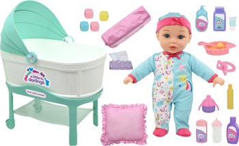 LITTLE DARLINGS: 12" BASSINET BABY DOLL SET - TEAL, PINK, STARS - Little Darlings 12" Bassinet Baby is a play set that everyone needs! This amazing set includes your very own plastic bassinet with moveable hood that can go up or down, wheels to roll your bassinet around if you want and a storage net on the bottom to store all of your many accessories that are also included ion this set. Our Bassinet baby is a 12" soft body doll with a removable outfit and matching hat. Be sure you care for every need your baby has; whether feeding, sleeping or changing you will have it all right here. Accessories included are a baby bottle, sippy cup, feeding dish with spoon, tissue box with tissue, pacifier, 4 building blocks, lotion tube, 4 play bottles, wipes bottle blanket and pillow. Place your baby in her bassinet for a nap but be sure to tuck her in with her blanket and pillow. She will be so cozy. Perfect for ages 2 and up. SET INCLUDES: 1-baby doll, 1-bassinet, 1-outfit, 1-hat, 1-pillow, 1-blanket, 1-pacifier, 1-tissue box, 1-tissue, 1-feeding dish, 1-spoon, 4-blocks, 1-sippy cup, 1-baby bottle, 4-play bottles, 1-lotion tube, 1-wipes bottle, 1-base to bassinet, 1-storage net.