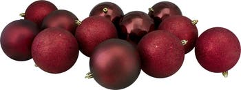 Bring a shimmering vibe to your Christmas tree display with these shatterproof ornaments. This exclusive assortment will allow you to build your collection quickly and decorate with more possibilities. Use them to decorate your tree or fill a decorative bowl for a shiny pop of color! Product Features: 12-piece set Color: burgundy Comes in 4 finishes: shiny, matte, glitter drenched and holographic glitter drenched Balls are equipped with gold ornament caps Pack of matching gold string hangers are included for optional use (ornament hooks not included) Dimensions: 3.25" (80mm) diameter Material(s): plastic/glitter Set includes 3 of each finish for a total of 12 ornaments