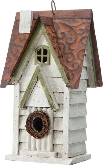 This elegant retro palette handcrafted distressed solid wood birdhouses featured with textured metal roof and 3D windows that adds a sense of artistic and rustic charm to your garden, backyard, or patio, providing a safe and sweet home for your lovely feathered friends.
