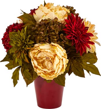 14-in Peony, Hydrangea and Dahlia Artificial Arrangement in Burgundy Vase