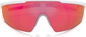 A wrapped shield silhouette enhances the fit of sporty sunglasses featuring iconic Ferrari logos at the temples for racer-inspired style.