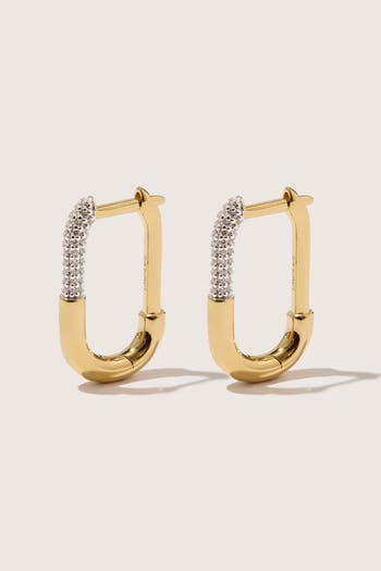 Stadium shaped gold hoops featuring pavé handset cubic zirconia and a graduated thickness. Handcrafted in 14-Karat gold vermeil on sterling silver.