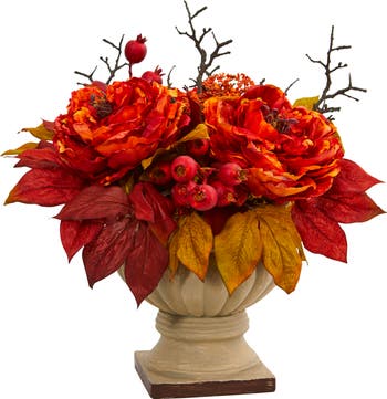 The thick red and green leaves on this peony sedum arrangement add to this artificial arrangement s volume. Orange like the setting sun, the peony s blooms are large and bold atop the bed of lifelike leaves. It is an excellent choice for a bold centerpiece.