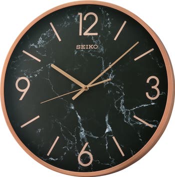 The 16" Noir Wall clock by Seiko is as elegant as its name. Evoking the look of black marble in a wall clock. Features include rose golden color numeral markings, quiet sweep and a glass cover. Powered by 1 AA battery (included). Overall dimensions: 16 X 16 X 1.8 inches. All Seiko clocks are equipped with quartz movement making it the most accurate at time keeping.