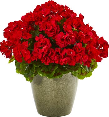 Incorporate serious coloring throughout everyday spaces with this artificial geranium plant flaunting a collection of intricate little floral nestled amidst vibrant green leaves peeping out from underneath - all of which is UV resistant, making it a great accent for both indoor and outdoor space. Contained in an accompanying planter, this 17” tall plant would beautiful spaces wherever displayed.