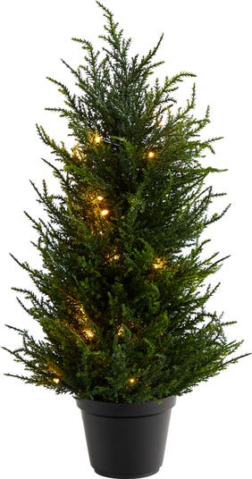 Transform your space into a cozy oasis with this Cypress Artificial Tree. Realistic, well-groomed fronds are shaped into an attractive elongated shape, nestled between warm LED lights. Standing 18" from a black nursey planter, set in a pot of your choice to bring the restaurant and European café look. Place in your entryway, bedside table, or next to your sofa. Battery operated; this faux cypress tree uses 2 AA batteries. Silk trees are manufactured using synthetic materials, such as polyester material or plastic, and are well designed and constructed to be life-like in appearance. This item will need to be re-shaped when removed from the secure box to allow it to reach its fullest size. Your artificial plant will look beautiful for years to come; simply wipe clean with a soft dry cloth when needed.