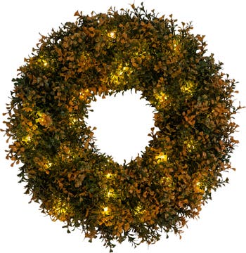 We love boxwood, and so do many of our customers. It s a classic that delivers a timeless look. Take your door to the next level this fall with our pre-lit autumn boxwood wreath. Crafted from high-quality materials, you ll notice the attention to detail in every leaf. Comes pre-lit with 25 warm white LED lights, creating a cozy fall glow. With a diameter of 18-In, it s perfect for filling any bare space. Designer tip: Add some ribbons or fall accents for an extra charming touch.