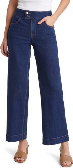 A dark wash without any fading adds to the clean, polished look of these full-length wide-leg jeans made with plenty of comfy stretch.