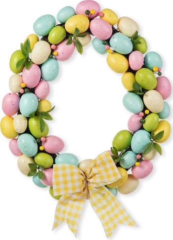 Celebrate the joy of Easter with our egg-shaped wreath, a stunning addition to your holiday decorations. Crafted with vibrant plastic eggs in shades of pink, yellow, green, and blue, this wreath brings a burst of color to your home. Adding a touch of elegance, a yellow bowtie adorned with a white checkered pattern graces the bottom of the wreath.