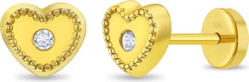 Delicately designed for baby girls and toddlers, these charming earrings are crafted from 18k yellow gold great for sensitive skin. Shaped like tiny hearts, each earring features an extra small clear cubic zirconia stone at the center, adding just the right touch of sparkle. With a secure safety push back closure, they offer both comfort and peace of mind for everyday wear. For gifting or as a precious first pair of earrings, these tiny hearts arrive in a small gift box for easy gifting.