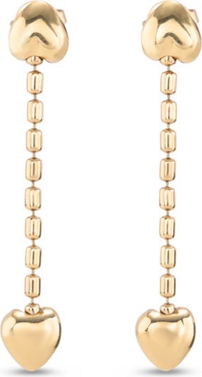18K gold-plated earrings with leather pendant chain and two small golden hearts.