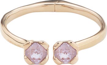 Rigid 18K gold-plated bracelet with an open spring design and two pink faceted crystals at the ends.