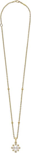 This handcrafted necklace stationed with signature Caviar beading is centered by a cultured pearl pendant haloed by diamond-accented beads.