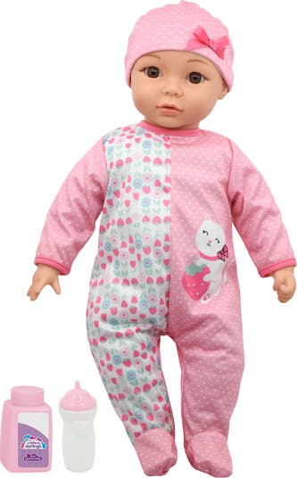 Little Darlings - 19 Inch Cuddle Baby with Accessories, Pink/Kitty - Cuddle Baby is perfect to snuggle and play with all day. Give Cuddle Baby a hug and she will make 6 different baby sounds. Cuddle Baby is approximately 19 inches long and is part of the Little Darlings interactive play doll collection that will delight little ones everywhere. Little Darlings brand encourages love, kindness and nurturing qualities the more children play and care for their doll. Designed for ages 2 years of age and up. Requires 3-LR44 batteries that are included. Includes 1 baby doll with an adorable outfit, baby bottle and a play bottle.