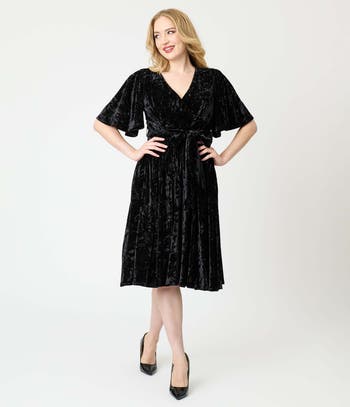 This stunning swing dress features dreamy short flutter sleeves and a flattering deep V-neck that beautifully accentuates your silhouette. Crafted from luxurious velvet, the attached self-tie sash cinches your waist just right, while the handy side pockets add a touch of practicality.