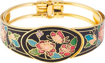 Radiantly playful. Gold plated Cloisonn bangle bracelet featuring black enamel and floral butterfly multicolour motifs. A hinged design with subtle Eastern influence and a soft click clasp that fastens effortlessly and securely. Cloisonn is an ancient enamelling technique rooted in Eastern design, known for its vibrant colour and intricate detail.