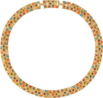 Beautiful craftsmanship with a touch of brilliant colour. 22ct triple gold plated decorative link necklace. Features links of prong-set faux pearl, turquoise and coral cabochons and multi-coloured round-cut Swarovski crystals. Closes with adjustable fold-over clasp