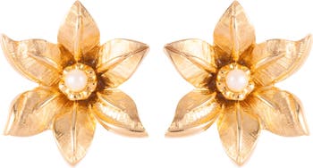 Modern elegance. 22ct gold plated statement flower design clip-on earrings. Textured design embellished with round faux pearl centre.