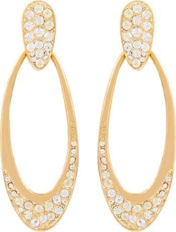 Make a statement. Gold plated clip-on earrings featuring a dramatic oval drop design embellished with round clear cut Swarovski crystals.