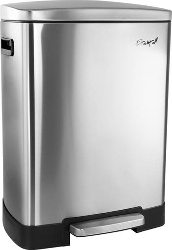 Elama s 10.6 Gallon Matte Silver Split Trash Bin is the ideal choice for any Home or Kitchen with its stainless steel, easy to clean finish and no touch pedal open function. This trash bin features a strong steel pedal engineered for a smooth and easy step that gives it stable operation, and two removable inner plastic buckets for convenient trash disposal. Dual inner buckets allow you to easily separate trash without the hassle of needing two cans. This bin includes one small 4 gallon inner bucket and one larger 6.6 gallon bucket, allowing you to separate your trash and recycling all in one place. Slow close lid is smooth and prevents loud slamming or fingers getting caught, while the built in side handles let you move can freely without needing to touch the bin. Keep your home and kitchen neat and tidy with this classic rectangular silver finished trash bin!
