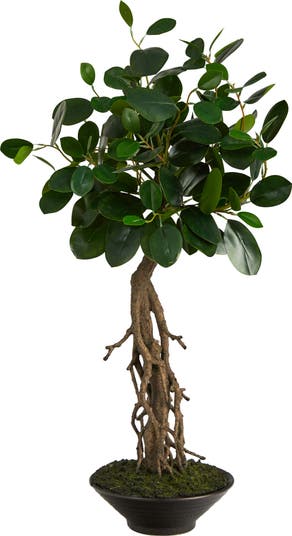 Love the Ficus? Bring it to your desktops with this Ficus bonsai artificial tree. If youft.ve wanted the airy yet full look of the Ficus in a mini version, you canft.t go wrong with this choice. Crafted from high-quality materials, brighten any space in need of some color and charm. Best of all? Zero maintenance! Standing 2ft. from a decorative planter (included in height), with faux moss, house in any desktop. Perfect for a desk, mantel, night stand and makes a great gift. Artificial trees are manufactured using synthetic materials, such as polyester material or plastic, and are well designed and constructed to be life-like in appearance. This item will need to be re-shaped when removed from the secure box to allow it to reach its fullest size. Your artificial tree will look beautiful for years to come; simply wipe clean with a soft dry cloth when needed.