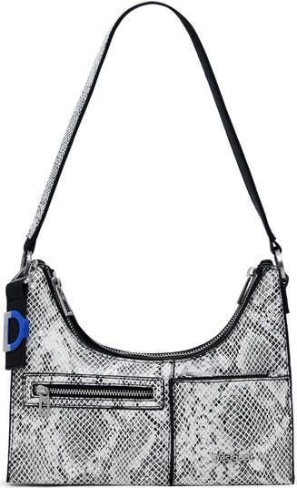 Glinting logo hardware highlights the curvaceous profile of a structured shoulder bag featuring a second removable bag and optional straps for on-the-go convenience.