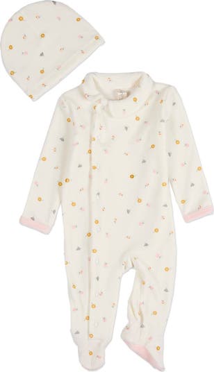 Keep your cherub cozy from head to toe with this baby girls footie set. It comes in ultra-plush velour, brushed on both sides for velvety softness. It s cotton-rich for breathable comfort, with a smidge of stretch for flexible fit. And it s adorned with a delicate floral print for feminine flair to spare.