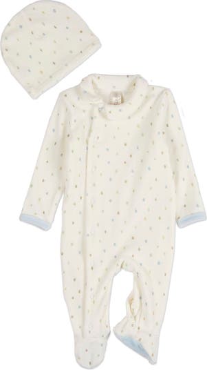 He ll be snug and cozy from head to toe in this 2-piece baby footie set. It comes in ultra-plush velour, brushed on both sides for velvety softness. It s infused with plenty of stretch, so he ll have wiggle room to spare. Plus, it s printed with pastel polka dots for playful charm galore.