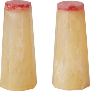 - A set of 2 adorable resin salt and pepper shakers with a two-tone design of marbled orange and pink colors