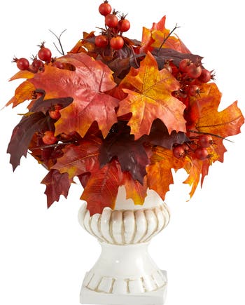 When you picture the perfect autumn landscape, the fall foliage is top of mind. Now you can craft your own spectacular scenery with this Maple Leaf Artificial plant. Inspired by the North American forests, we designed your plant with naturally occurring details and vibrant shades of variegated perfectly, imperfect leaves, accented by faux berries that mimic the fall foliage. Standing at 20” from a white urn, showcase mother nature s best during the Thanksgiving dinner table, Halloween or cozy nights in. Perfect for a family fun DIY fall design session.