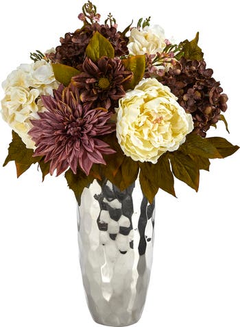 22-in Peony, Hydrangea and Dahlia Artificial Arrangement in Silver Vase