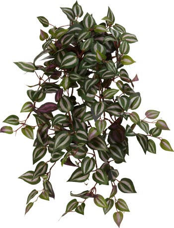 Numerous small, delicate variegated green leaves cascade down like a waterfall with this artificial wandering Jew hanging plant. With purple leaves intermingled with in, this combination creates an alluring and calming aura in any room. However, its quiet and subtle beauty works best in a bedroom when draped over a vanity or full length mirror.