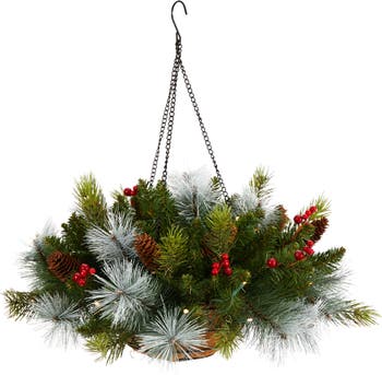 Spread holiday cheer in those tough to reach areas with this pine and berries artificial Christmas hanging plant. Display your Christmas cheer with these fine evergreens branches, accented by pine and berries, so lifelike you ll think they re real. Light up this accent with the pre-strung 30 LED lights. Standing 24in., add to any space in need of some life. Perfect for a compact area or a space that needs more holiday cheer. Artificial plants are manufactured using synthetic materials, such as polyester material or plastic, and are well designed and constructed to be life-like in appearance. This item will need to be re-shaped when removed from the secure box to allow it to reach its fullest size. Your artificial plant will look beautiful for years to come; simply wipe clean with a soft dry cloth when needed.