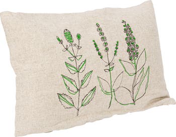 24 Inches Hand-Embroidered Linen Blend Printed Lumbar Pillow with Botanicals, Kantha Stitch, and Flanged Edge