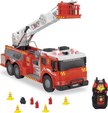The Dickie Toys 24 in. Light and Sound RC Fire Truck with Working Pump features a cool water spray function that is guaranteed to provide hours of endless fun for your little one. The extendable arm of the toy truck allows the firemen to easily climb to inaccessible areas. The large model truck can be moved in all directions via the 2-channel remote control.