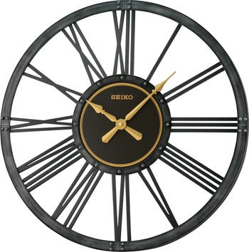 Seiko 24" Bennett is farmhouse inspired style oversized large round wall clock that will give your interior that rustic warm and cozy feel. Antique black in color with wooden 3D Roman numerals this clock eschews modern sensibilities. On trend, add this clock to your family room, living room, kitchen or any space. Powered by 1 AA battery (included). Overall dimensions: 24 x 24 x 1.3 inches. Quartz movement completes this upscale home decor piece.