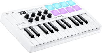 Portable 25-key USB MIDI keyboard with semi-weighted keys, 16 drum pads, 8 knobs, Bluetooth, and DAW support. Create and perform anywhere, anytime.