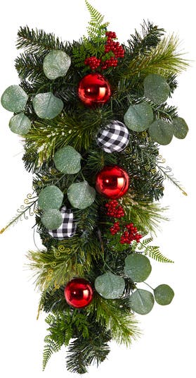Greet guests with a bit of festive cheer. Display your holiday-inspired artificial Christmas swag in any space in need of some freshness. Variegated green evergreens are accented by glossy ornaments. Hang in any room in need of some Christmas colors. With a height of 26in. house in any area. Gift to a friend that loves the holidays. Artificial swags are manufactured using synthetic materials, such as polyester material or plastic, and are well designed and constructed to be life-like in appearance. This item will need to be re-shaped when removed from the secure box to allow it to reach its fullest size. Your artificial plant will look beautiful for years to come; simply wipe clean with a soft dry cloth when needed.