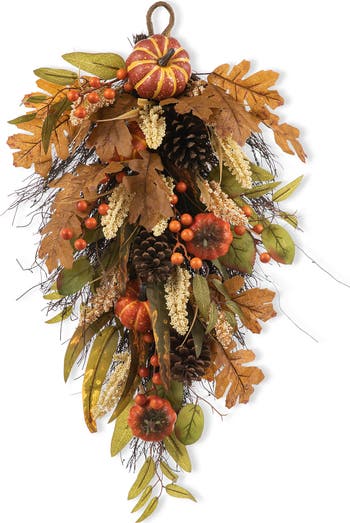 Wonderful item for Fall to add style, color and interest to your home! This exquisite wreath cleverly combines various autumn elements such as green leaves, pumpkins, pine cones, and berries, showcasing the rich colors of nature and adding a profound and pleasant autumn atmosphere to your home.