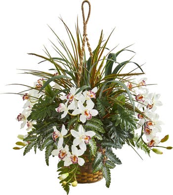 29-in Cymbidium Orchid and Mixed Greens Artificial Plant Hanging Basket