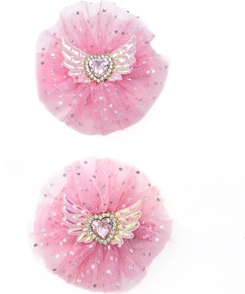 Add a magical touch to any hairstyle with these dreamy winged clips. Each set features layered sparkly tulle, iridescent wings, and a heart gem centerpiece—perfect for fairy dress-up days, birthdays, or everyday sparkle. Comes in a charming keepsake tin—perfect for gifting or storage. Includes 2 winged clips per set Features tulle, heart gem, and iridescent wing details Available in two colors: Ivory Pink and Rose Pink Lightweight, whimsical, and easy to wear Made in Korea Size: 3.1" (8 cm)