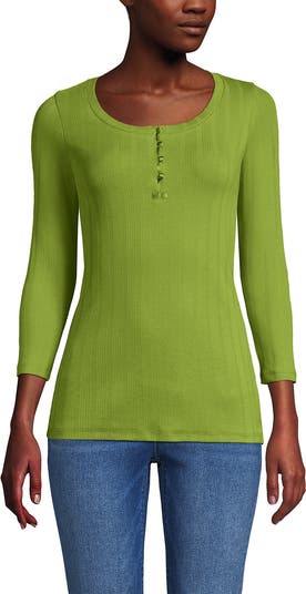 A customer-favorite micro rib knit gets a fresh update in a subtle variegated pattern for just the right amount of texture. This henley top is designed with a flattering scoop neckline, satin-covered buttons, and a touch of satin trim at the placket. It s both pretty and practical. Three-quarter sleeves offer versatility.