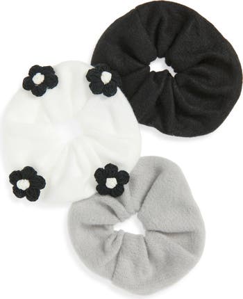 Toss up your tresses with this assorted set of knit scrunchies featuring two solid versions and a third with artisanal floral appliquès.