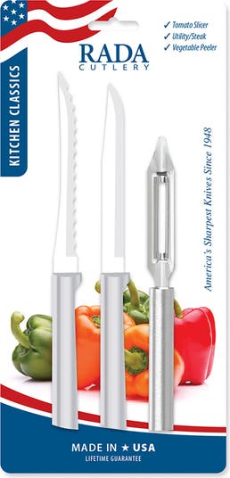 The Rada 3 Piece Knife Set ProPak includes a 5" Tomato Slicer Knife, Vegetable Peeler, and 4.8" Utility/Steak Knife. Each tool is made in the USA from surgical-grade T420 high-carbon stainless steel and hand-sharpened to a razor-sharp edge. Perfect for slicing, peeling, and trimming, this set combines precision, comfort, and durability for everyday use.